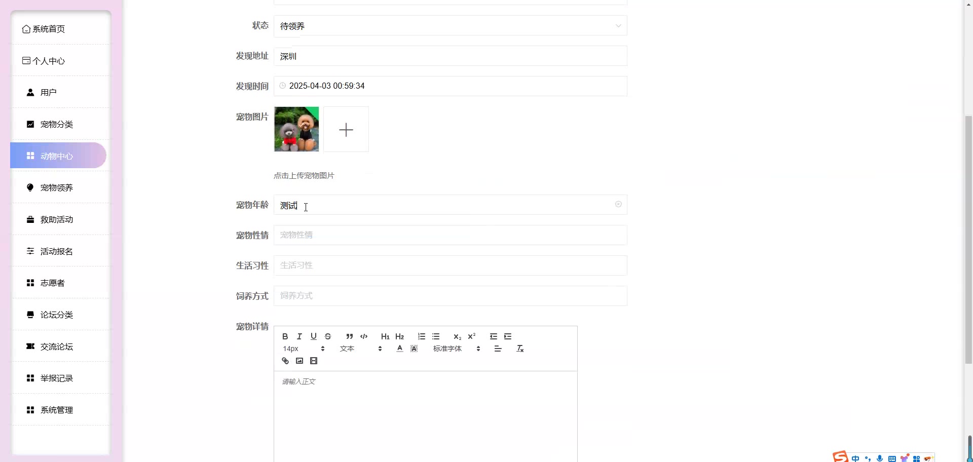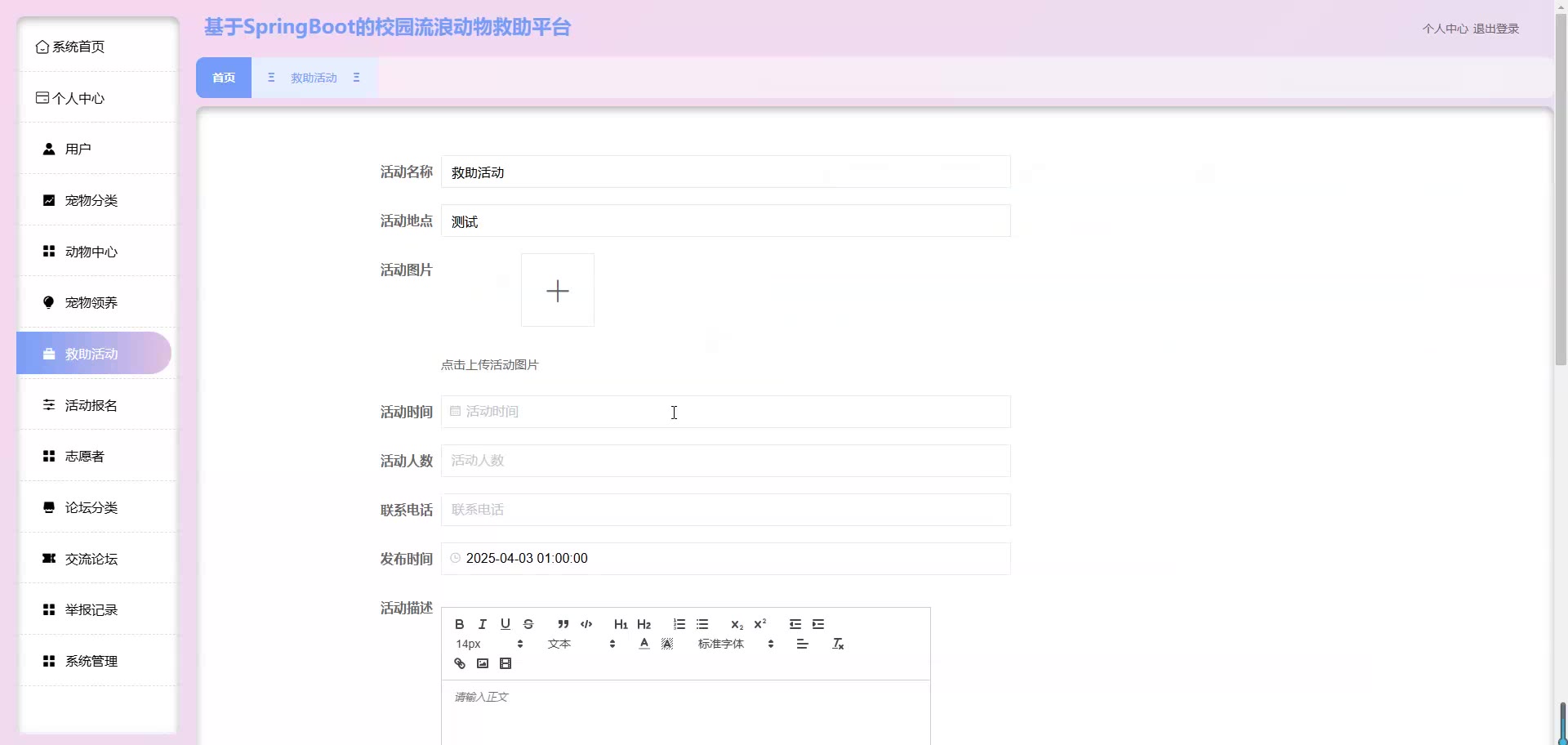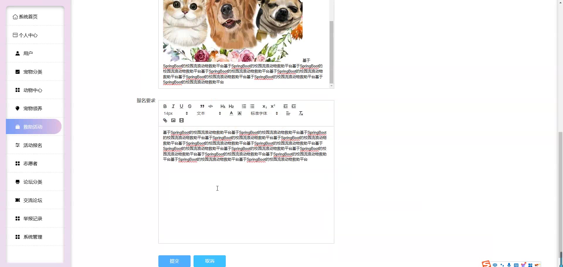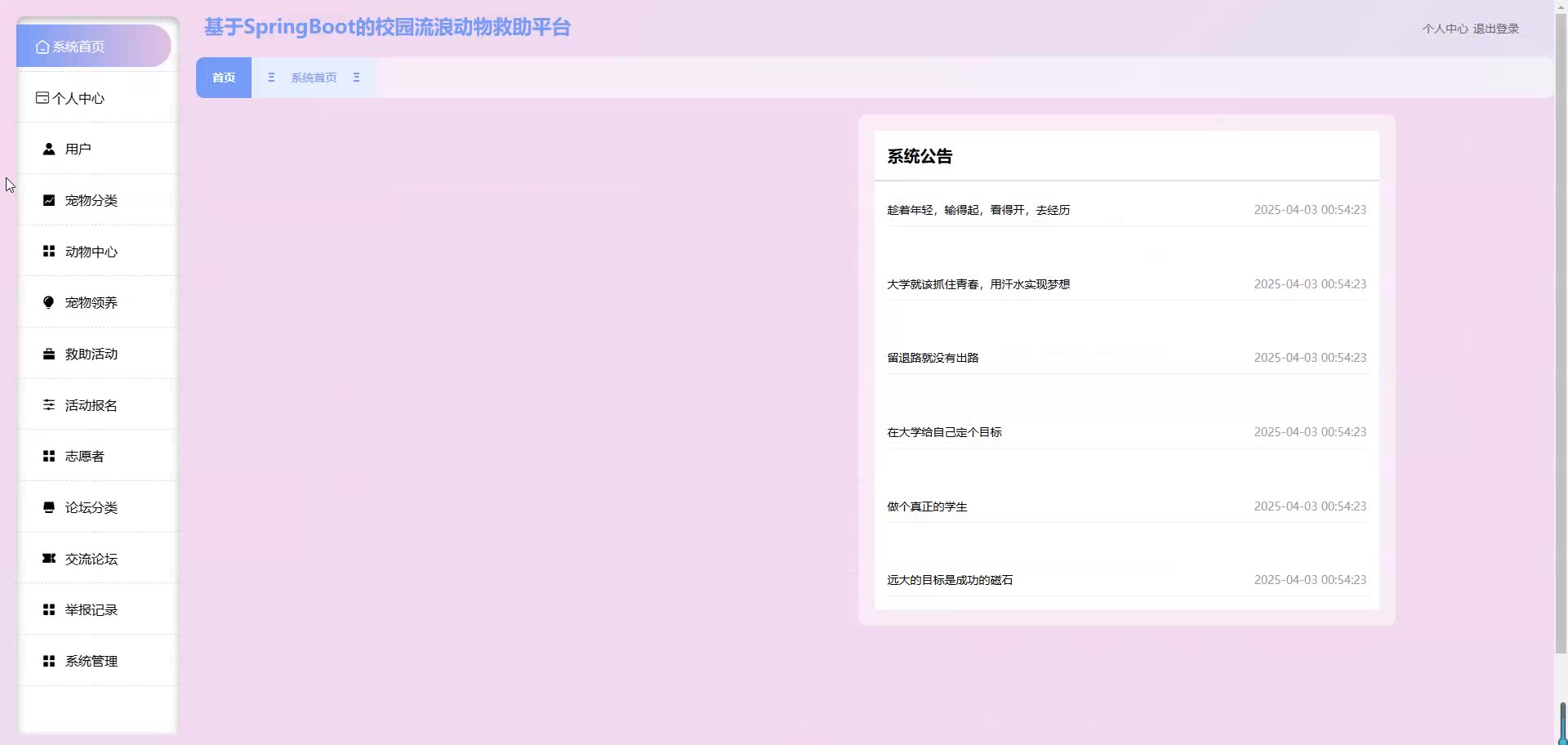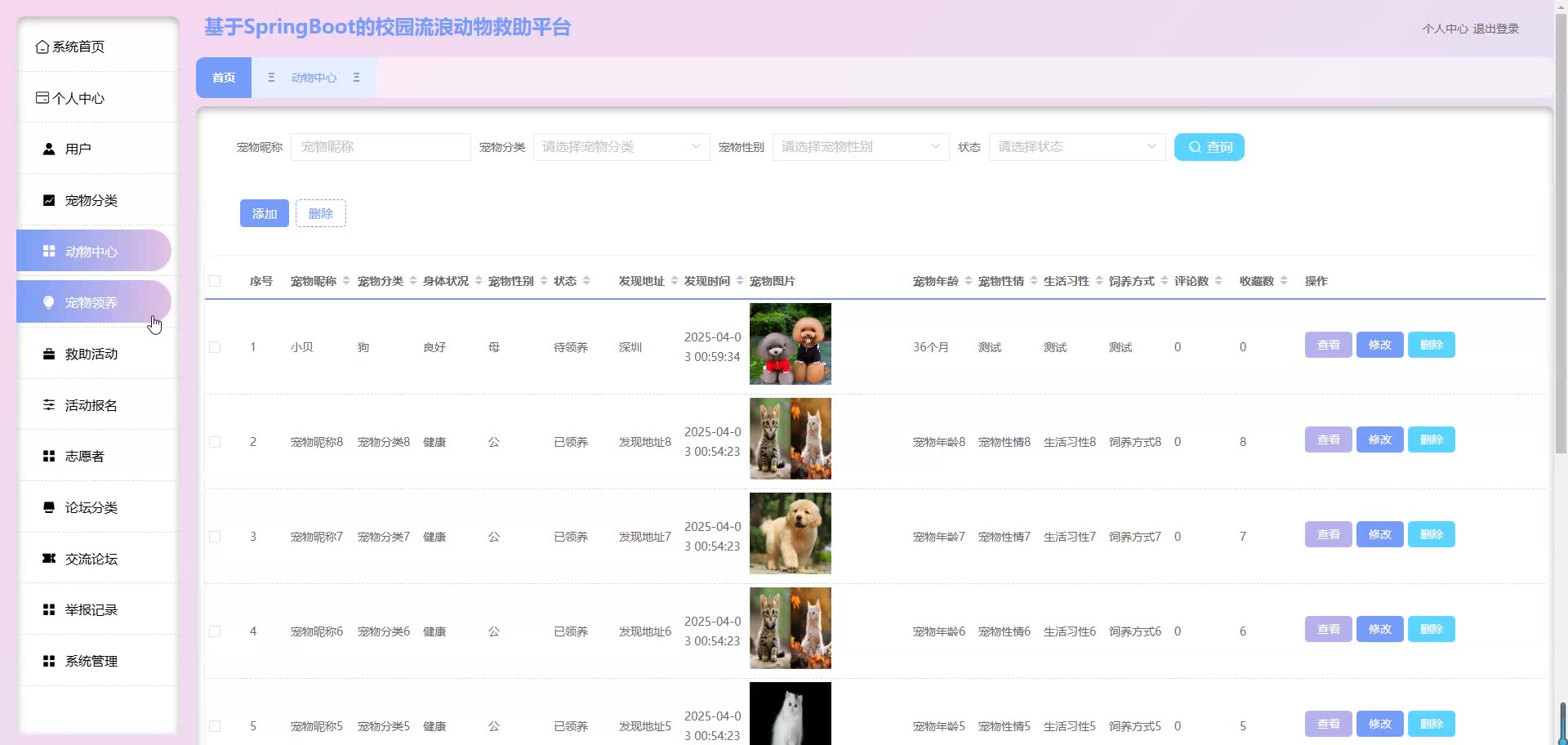 基于SpringBoot Vue的校园流浪动物救助平台源码+论文springboot1861