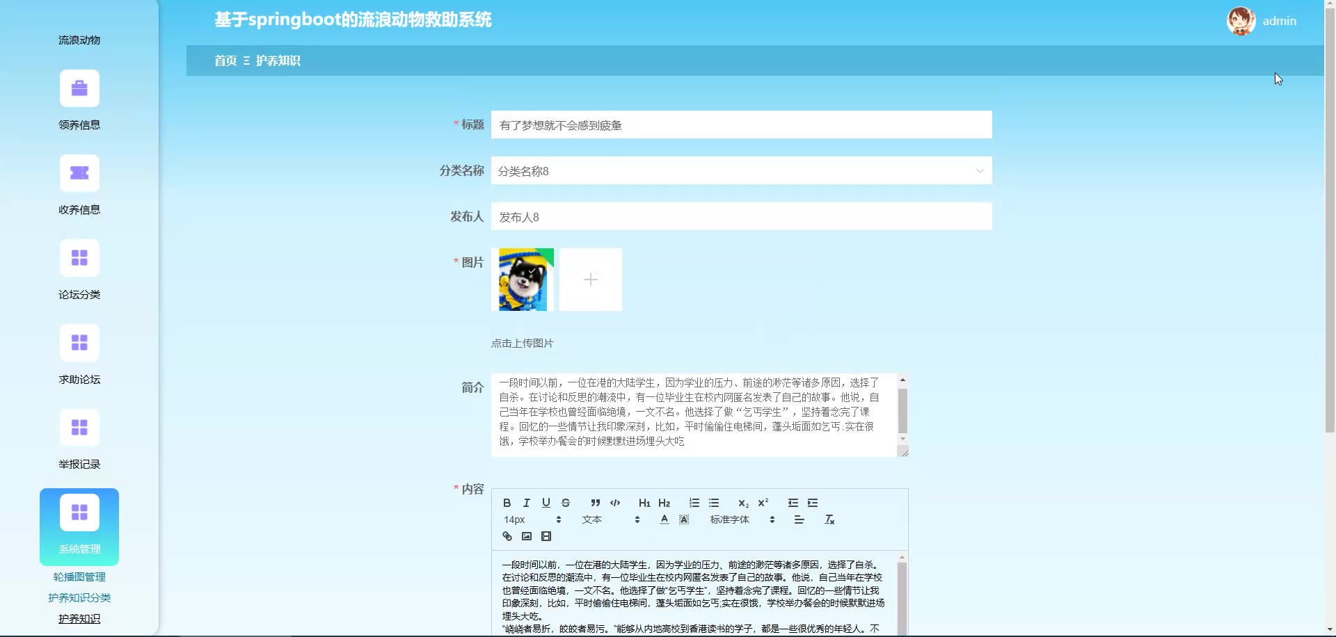 基于SpringBoot Vue的流浪动物救助系统源码(提供导入教程+讲解)springboot2124