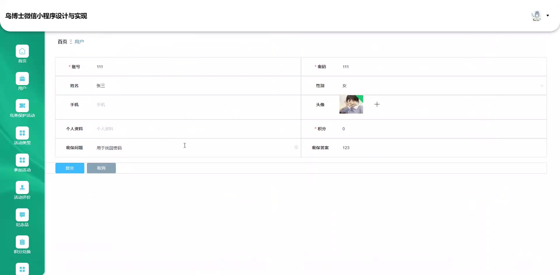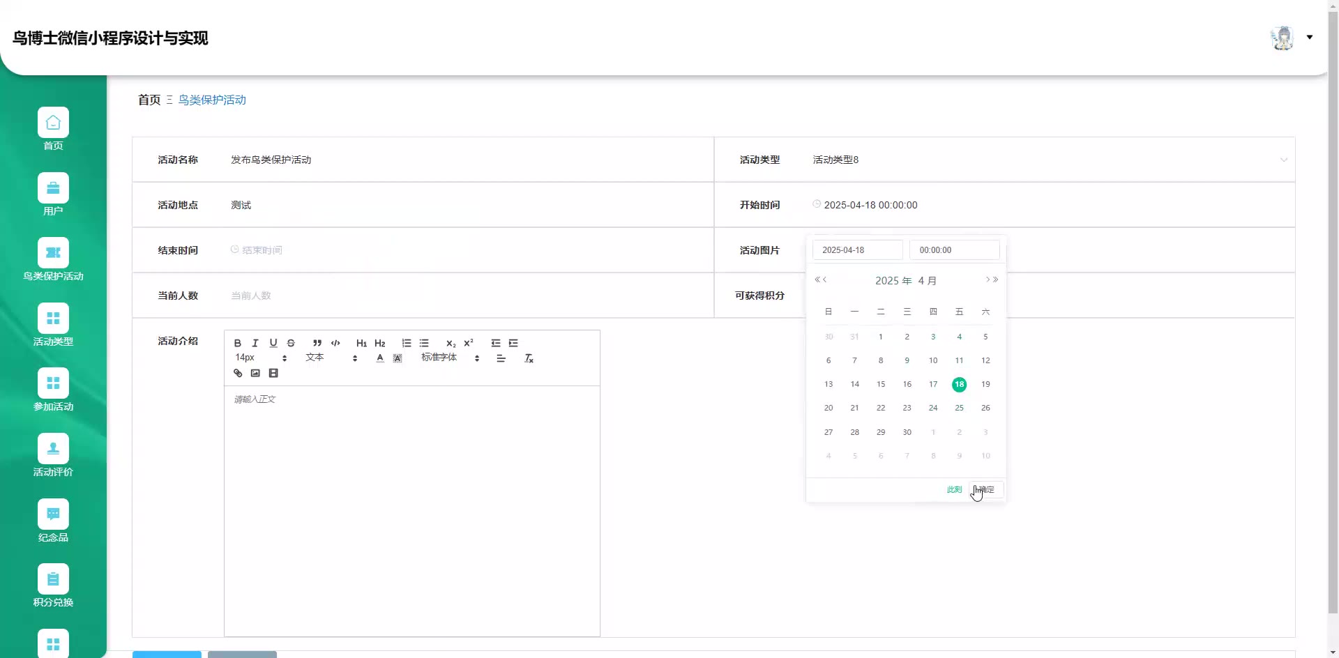 基于SpringBoot+Vue的鸟博士鸟类保护活动管理微信小程序源码+论文weixin648